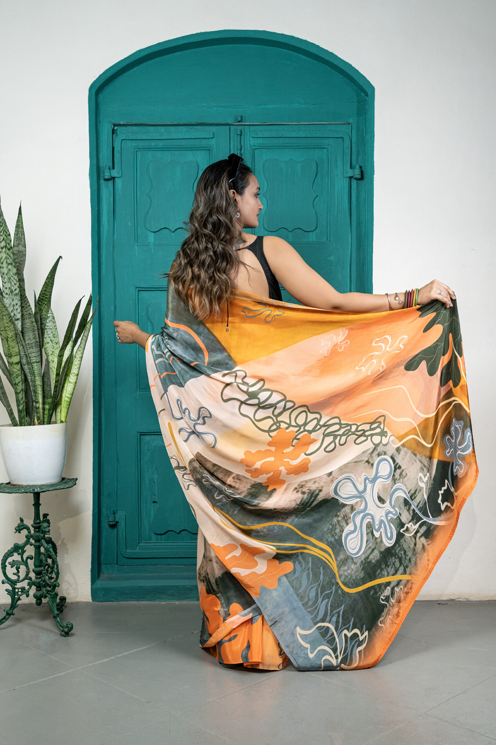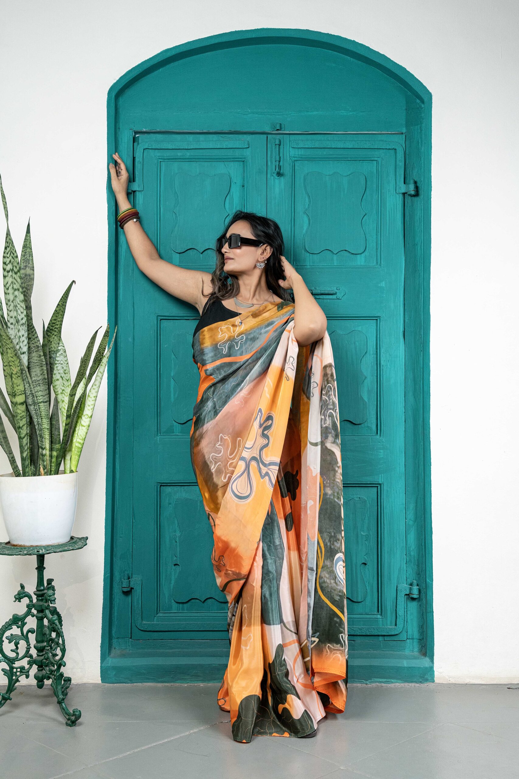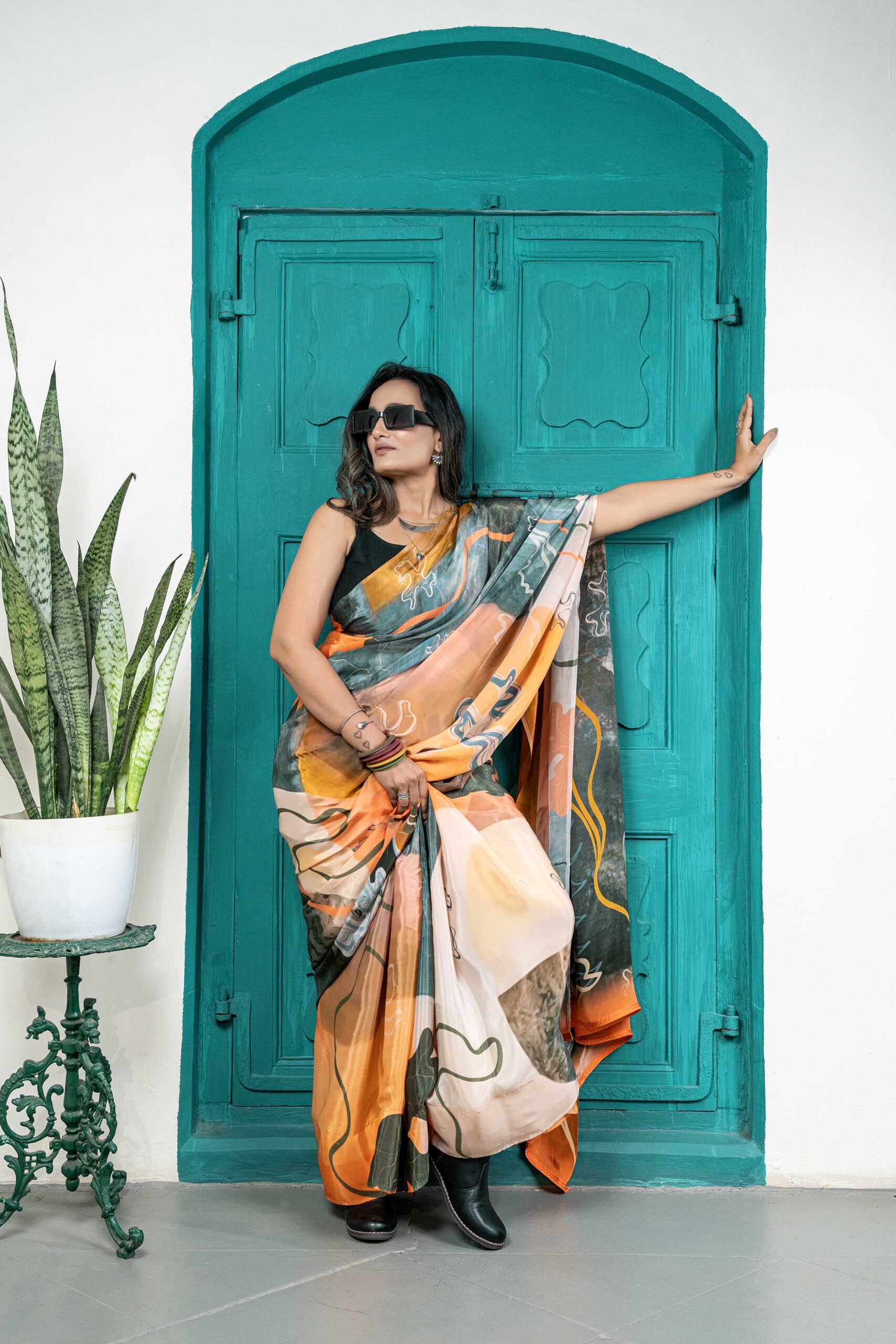 Overlap crepe saree bringing timeless elegance to your wardrobe. Soft to the touch and easy to drape, it’s perfect for festive occasions, office party or special evenings.